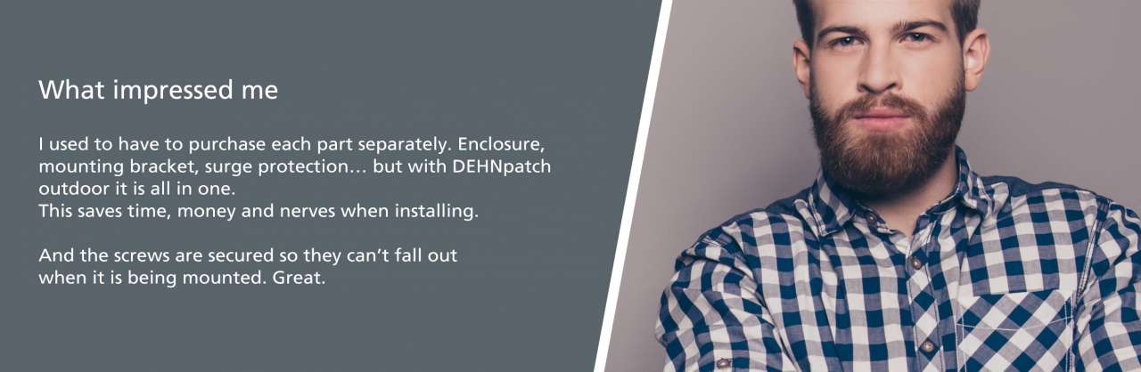 DEHNpatch outdoor, the new complete unit comprising surge protection and an outdoor enclosure protects your surveillance cameras, PoE++/4PPoE and other GBit Ethernet applications with a lightning current discharge capacity of in total 4 kA (10/350 µs).