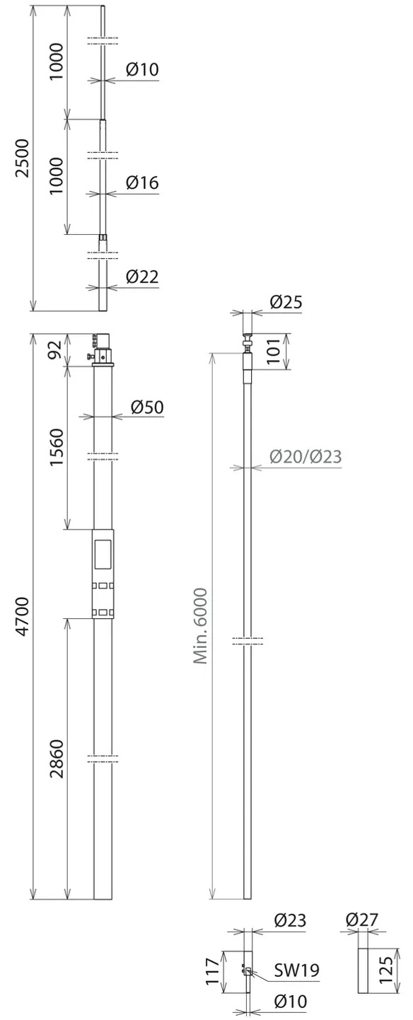 | Max. free length with air-termination rod (wall mounting) | 5500 mm |