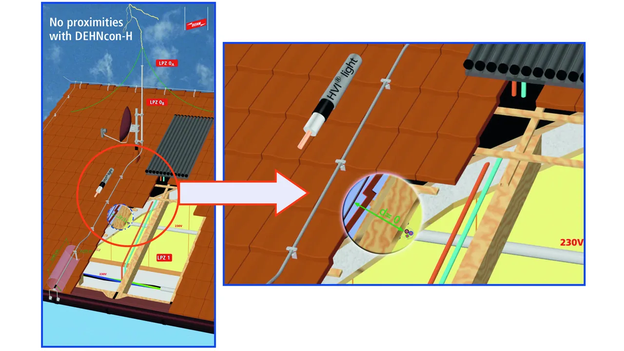 When installing bare, uninsulated air-termination conductors directly on the roof, the separation distance to electrical and metal systems installed under the roof surface must be maintained in accordance with the state of the art and the current lightning protection standard DIN EN 62305-3 (VDE 0185-305-3). Cable installations, pipe systems and metal parts are frequently installed under the roofing in direct proximity to air-termination systems/down conductors, thus posing a proximity issue. The solution for such proximity issues is a separated air-termination system with high-voltage-resistant, insulated down conductors.