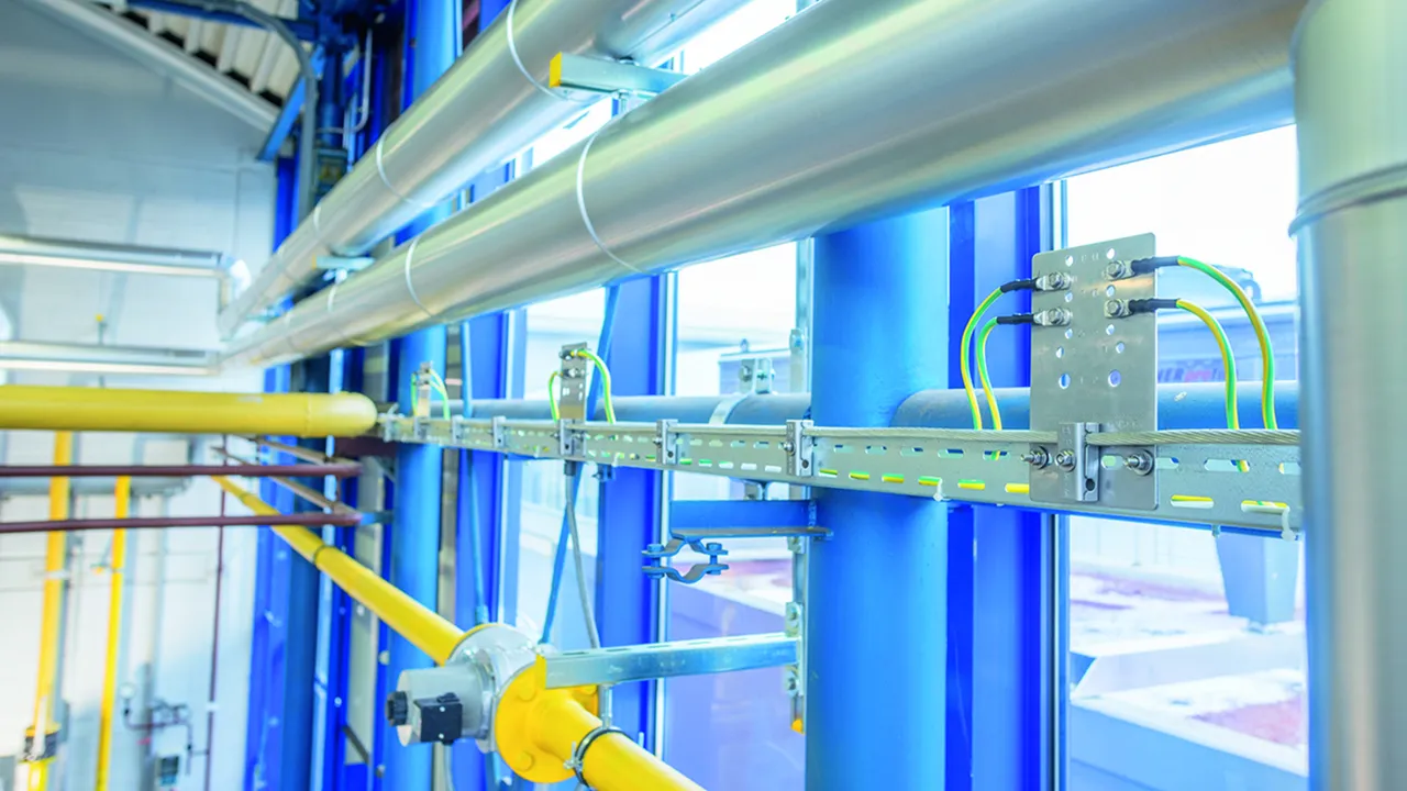 The equipotential bonding system is mounted on cable tray systems. All conductive system parts and electrical equipment are integrated in the Ex equipotential bonding by means of equipotential bonding plates and clamps as well as a closed ring equipotential bonding conductor.