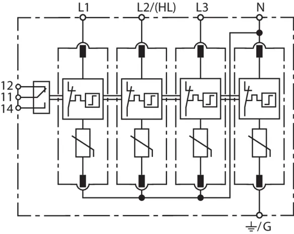 | Max. continuous operating voltage AC [L-N] / [H-N] / [L-G] / [H-G] / [L-L] / [L-H] / [N-G] | 230 V a.c. / 275 V a.c. / 410 V a.c. / 455 V a.c. / 460 V a.c. / 505 V a.c. / 180V a.c. |