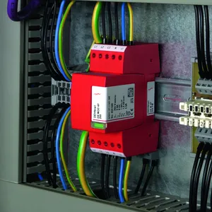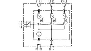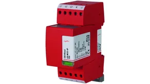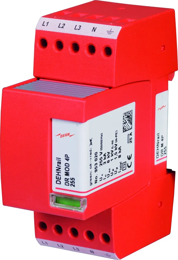 Four-pole surge arrester consisting of a base part and a plug-in protection module; with floating remote signalling contact. Can be used for systems with a fusing up to 32 A.
