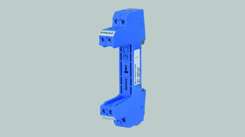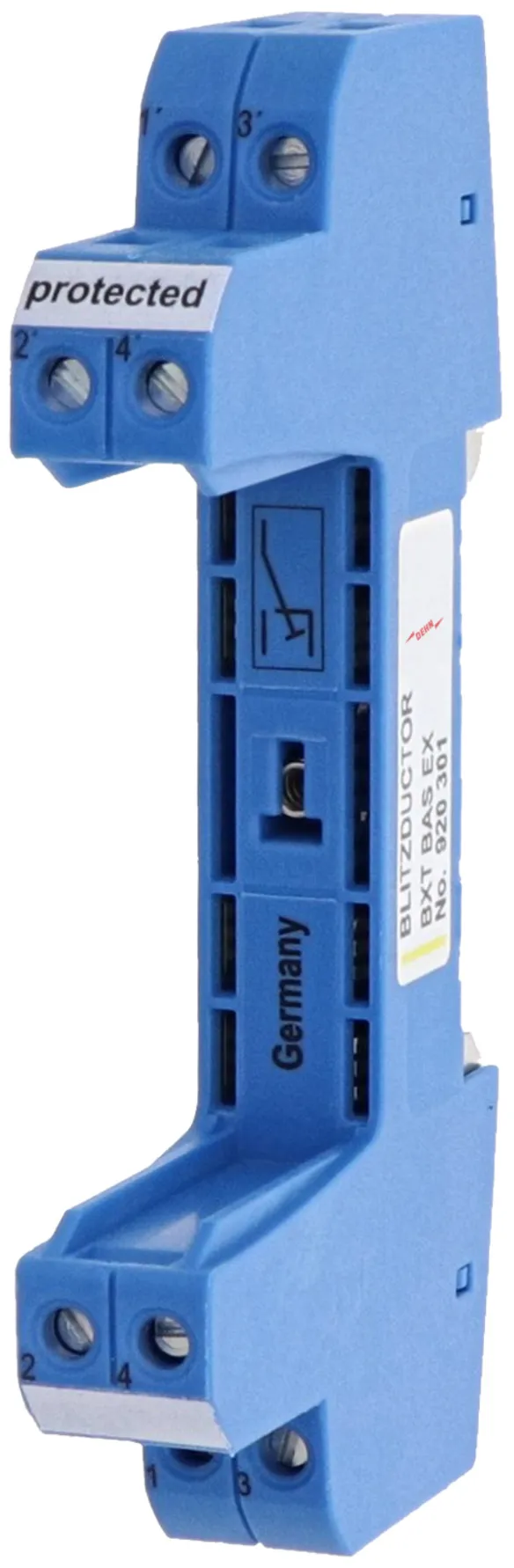 BLITZDUCTOR XT base part for use as an extremely space-saving and universal four-pole feed-through terminal for intrinsically safe circuits for the insertion of the protection module, no signal disconnection if the protection module is removed. The snap-in mechanism at the supporting foot of the base part allows the device to be safely earthed via the DIN rail. Since no components of the protective circuit are situated in the base part, only the protection modules need to be serviced.