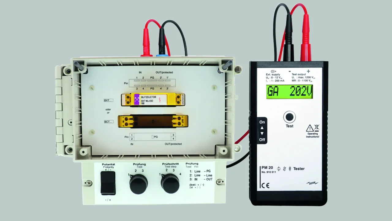 Combined device for testing the sparkover voltage of surge arresters (with gas discharge tubes / varistors / Zener diodes). Storage bag and measuring accessories included.