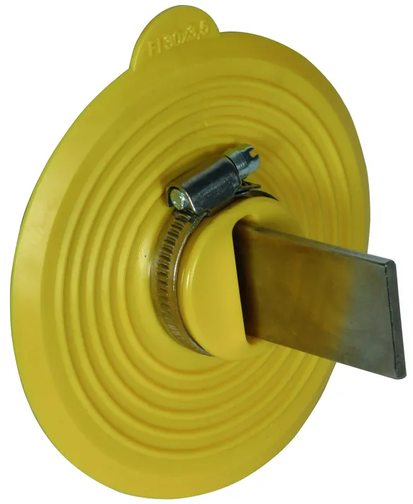 Sealing collar for bushings in case of water-tight foundation slabs / walls (e.g. white tank). Water-pressure-tight, to be pushed/positioned on round conductors with StSt tensioning straps. Pressurised water test up to 1 bar represents an installation depth of 10 m in stagnant water, additionally tested with 5 bar compressed air according to EN 62561-5.