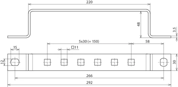 Earthing busbars for screwing on steel contructions, hole spacing 35 mm.For connecting: