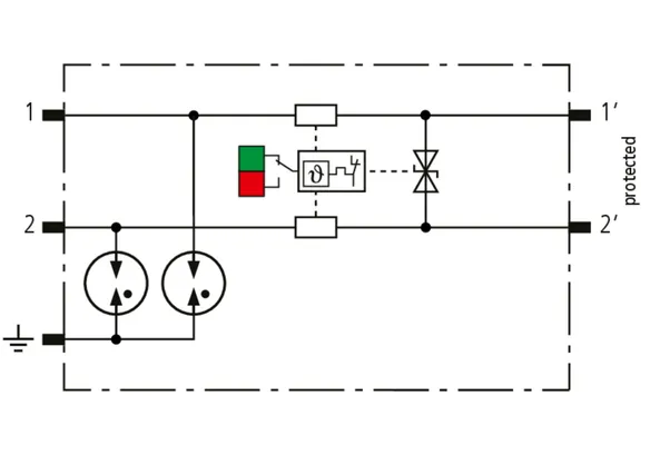 Space-saving, compact surge arrester with a width of 6 mm and push-in connection technology with status indication. Finely limiting, single-stage surge protection with powerful diodes for protecting two single cores sharing a common reference potential as well as unbalanced interfaces.