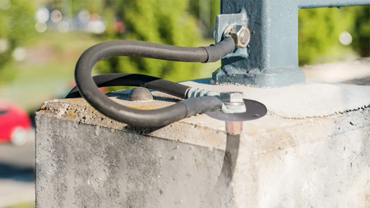 The earthing bridges are designed for earthing, return circuits and equipotential bonding in railway line applications. The version for earthing large pipes is intended for use with pile and large pipe foundations. The product consists of a copper cable with a pressed-on sleeve and stainless steel connection plate with integrated boreholes for the formwork fixing at one end, and a cable lug at the opposite end. The cable lug is used to establish a short-circuit-resistant connection to the pile or large pipe foundation. The flexibility of the cable simplifies installation in the reinforcement for the user. This earthing bridge also has the technical approval of DB Netz AG and can be used there without hesitation in planning.