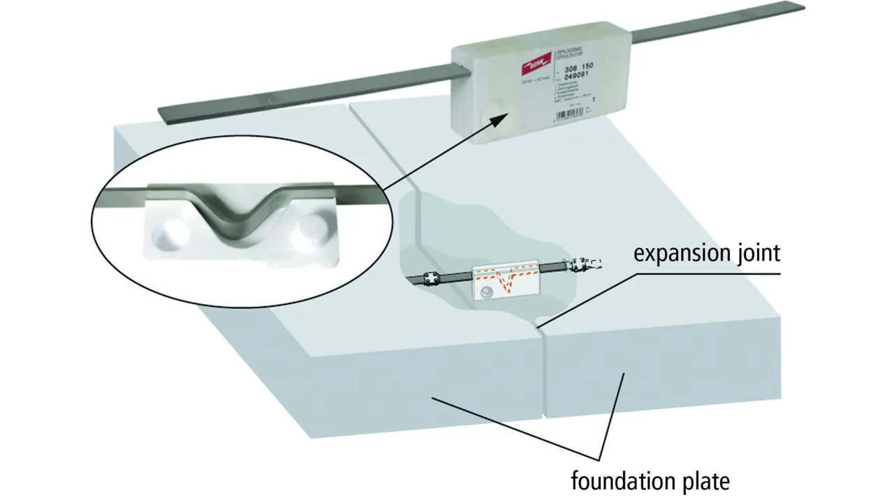 For leading the foundation earth electrode through the expansion joints of large foundations (several sections). It is not necessary to lead the earth electrode out of the base plate, because the polystyrene block can be concreted in the one section, the other end of the strap will be carried on loosely in the opposite section.