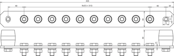 Equipotential bonding bar, industrial design, 10 terminals w. insulators, StSt