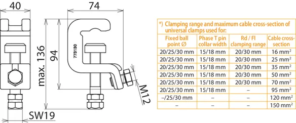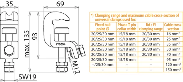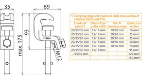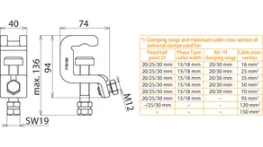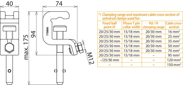 | *) See table for „Clamping range and maximum cable cross-section of universal clamps used for" | |