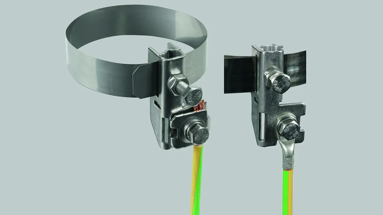 Pipe clamp for electrically contacting pipes in Ex zone 2/22. The pipe clamp is secured against self-loosening according to DIN/EN 62305-3 Supplement 2.