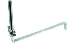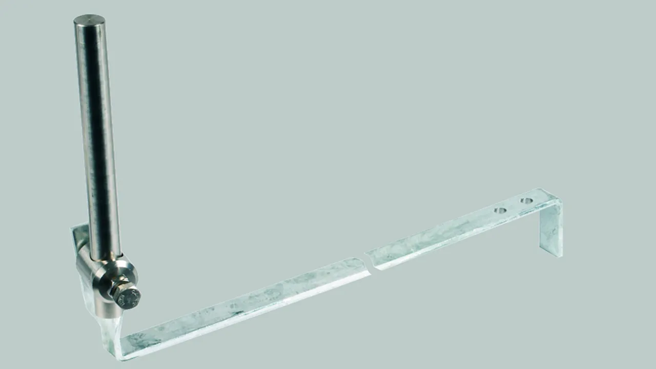 Base for fixing air-termination rods on steep roofs, with anti-rotation protection (toothed lock washer) and lock nut as well as boreholes for screwing the brace onto the roof battens.